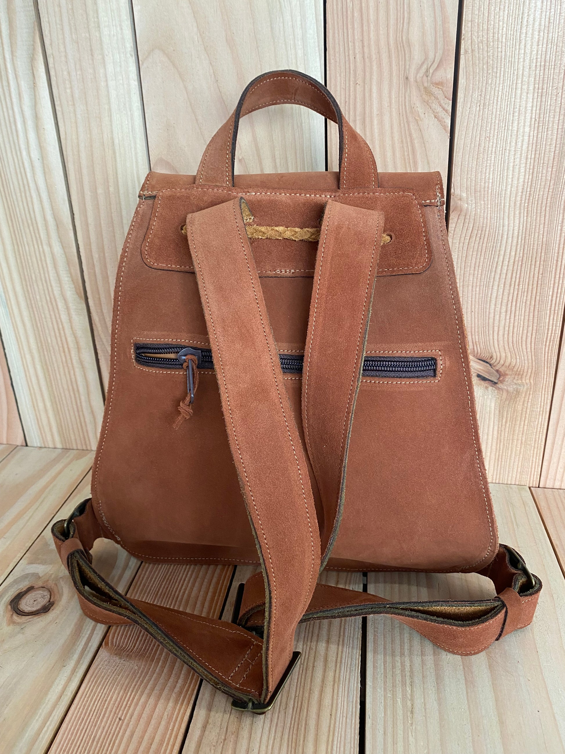 A stylish rucksack with a flap over a drawstring opening. There is a zip compartment on the back to keep sticky fingers away from particular valuable when in crowded places. The straps are really comfortable to wear and its a great every day size.